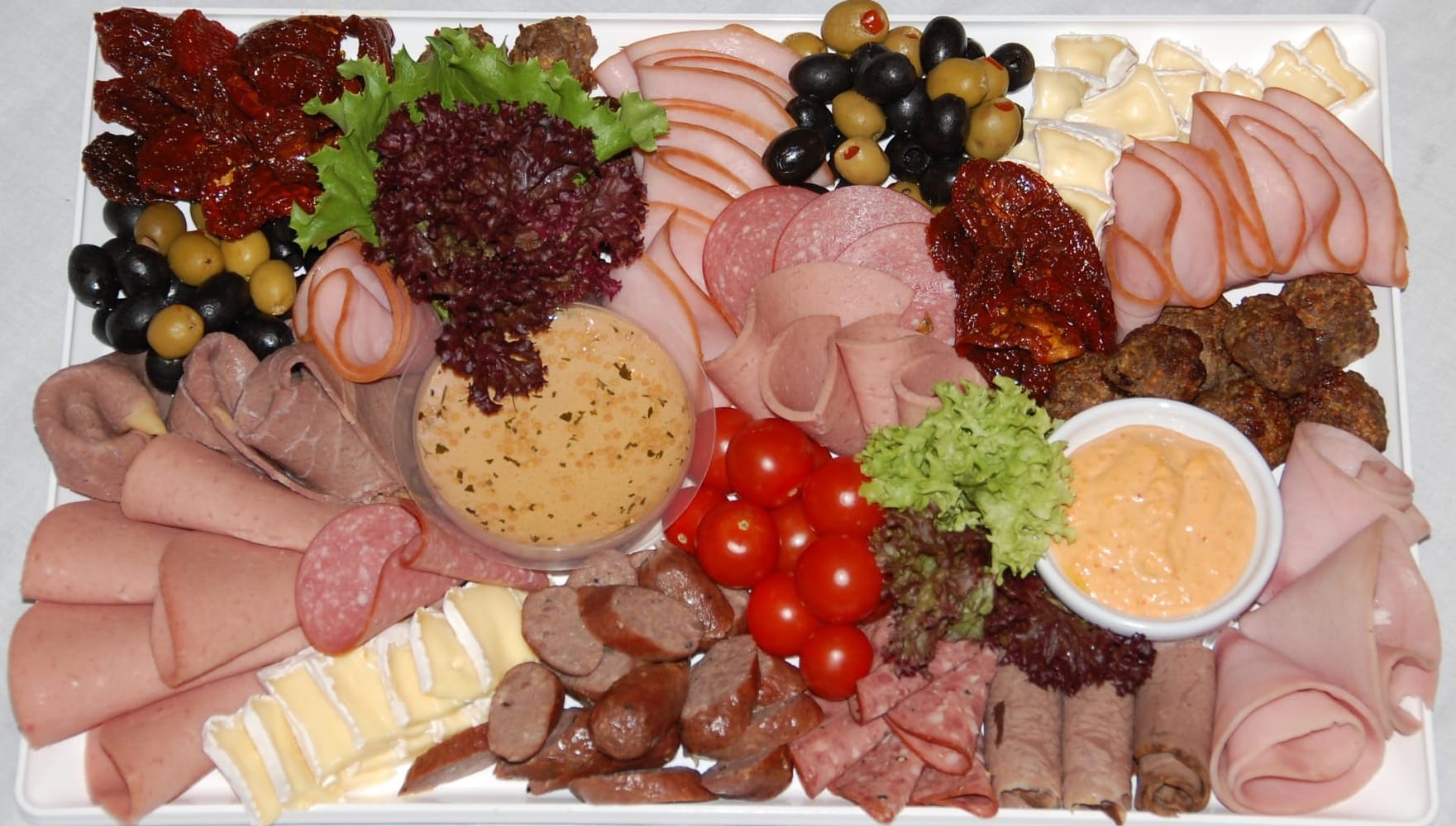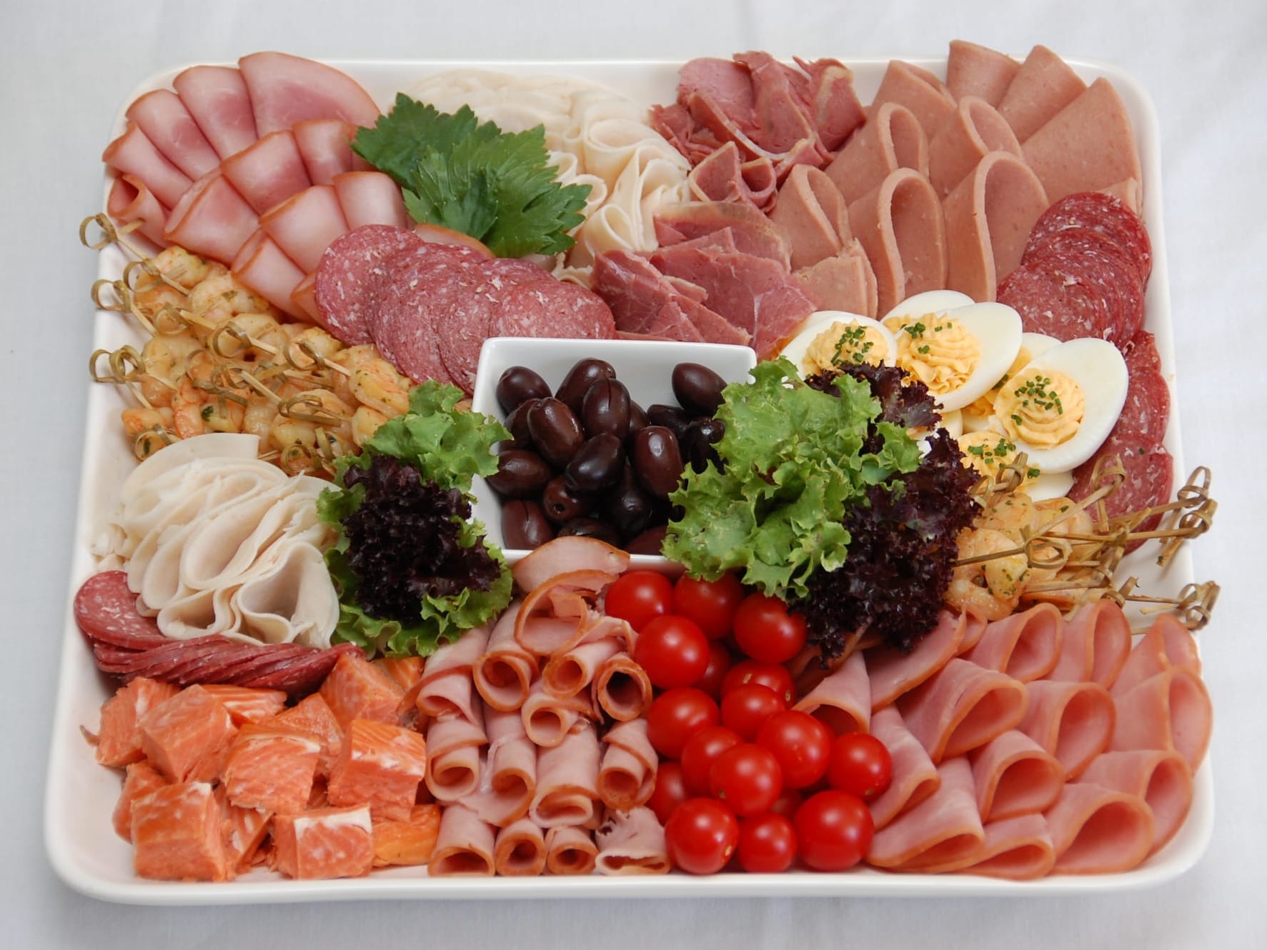 The rolled meat fold used on open Danish sandwiches and a meat and seafood platter.