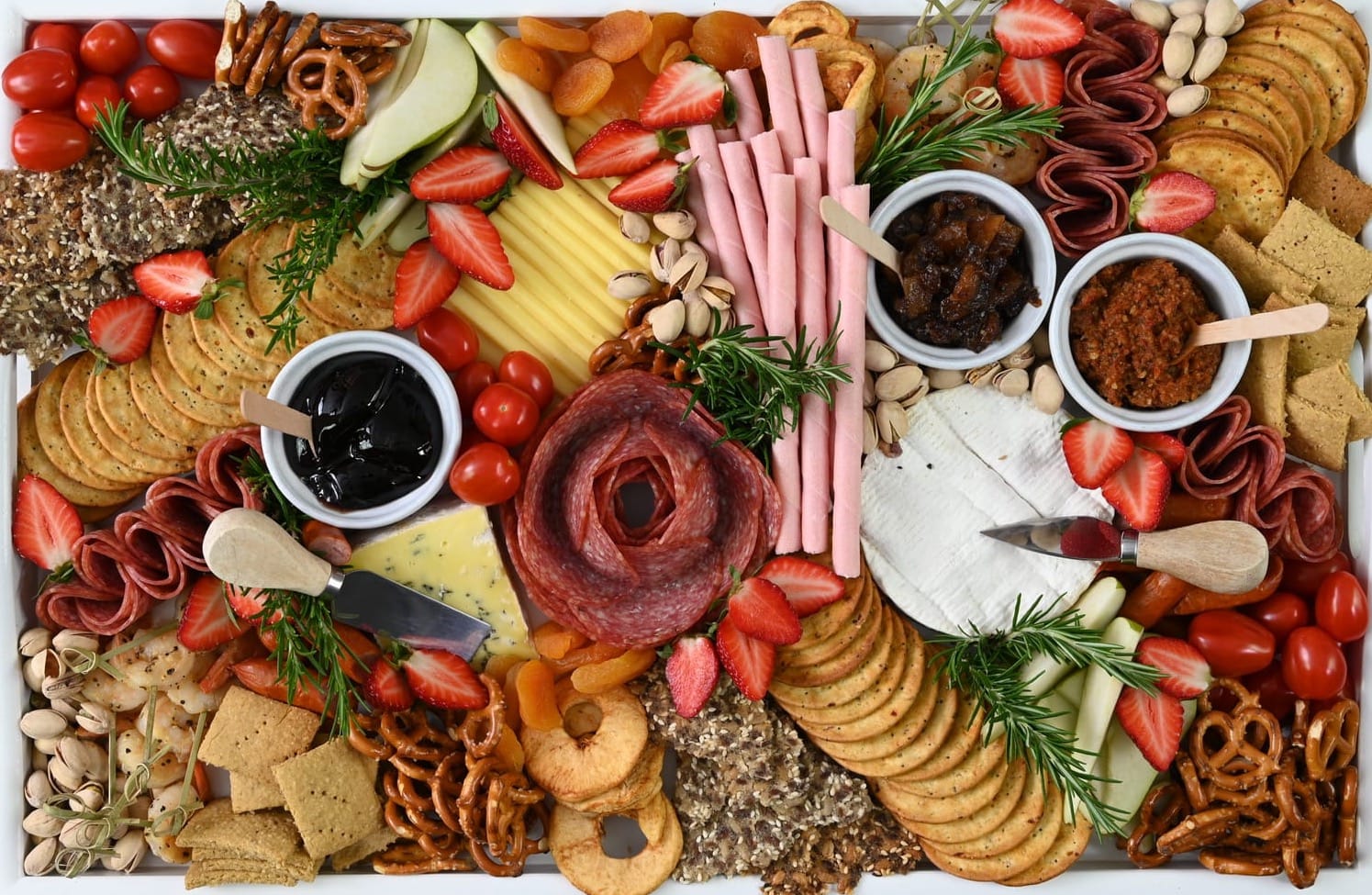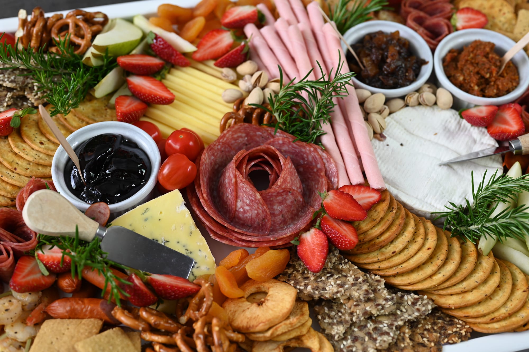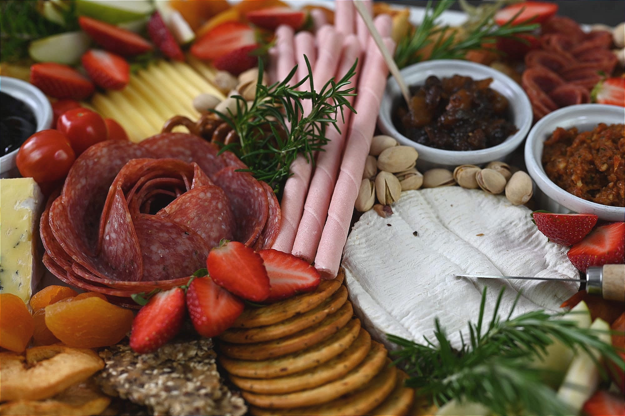 A meat rosette, often made with sliced salami because it is a little thicker and holds its shape better, is the perfect central point for a platter. It looks great on a cheeseboard if you want to add some protein too.