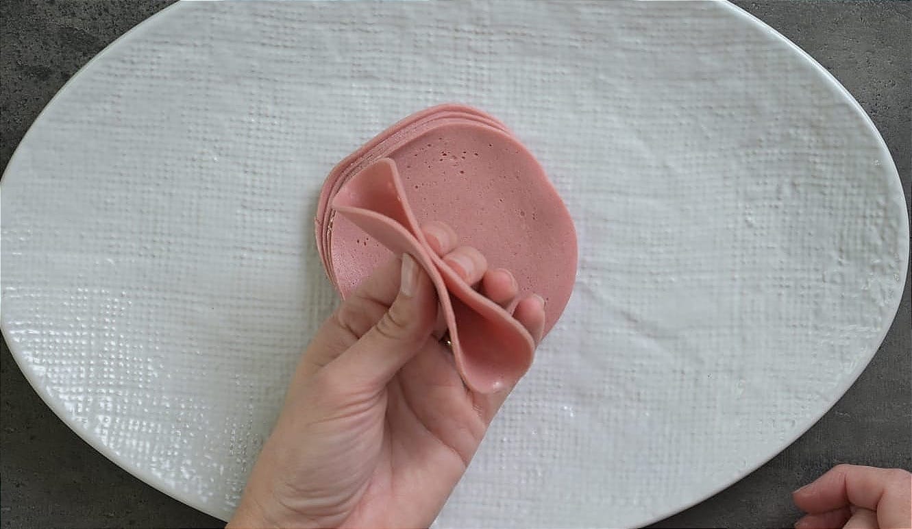 - Loosely fold thin, round slices of cold meat in half, and then loosely in half again.