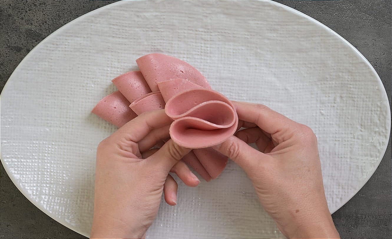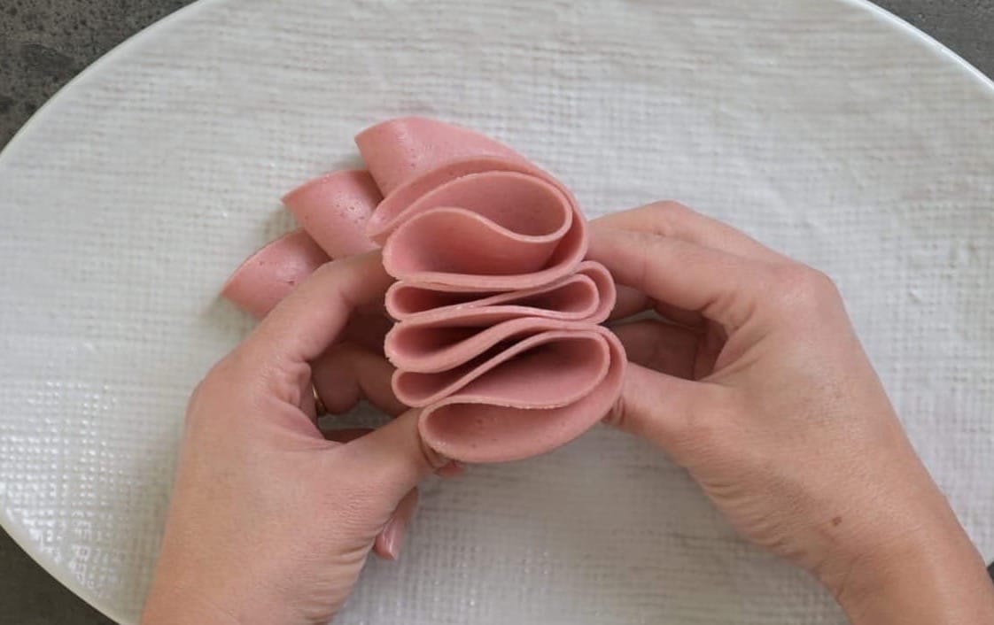 Step-by-step making a salami rose.