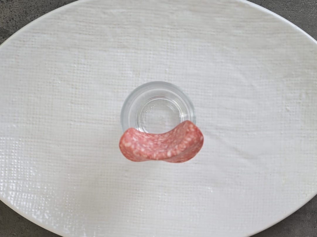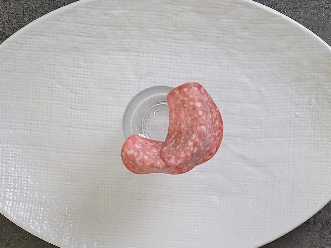 - Fold a slice of salami over the rim of the glass.