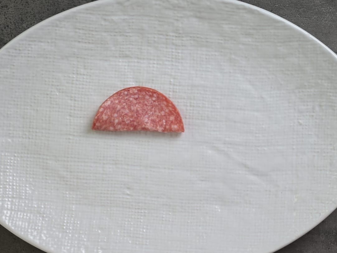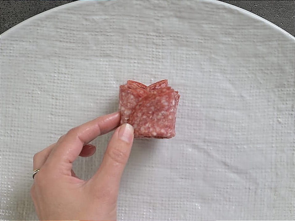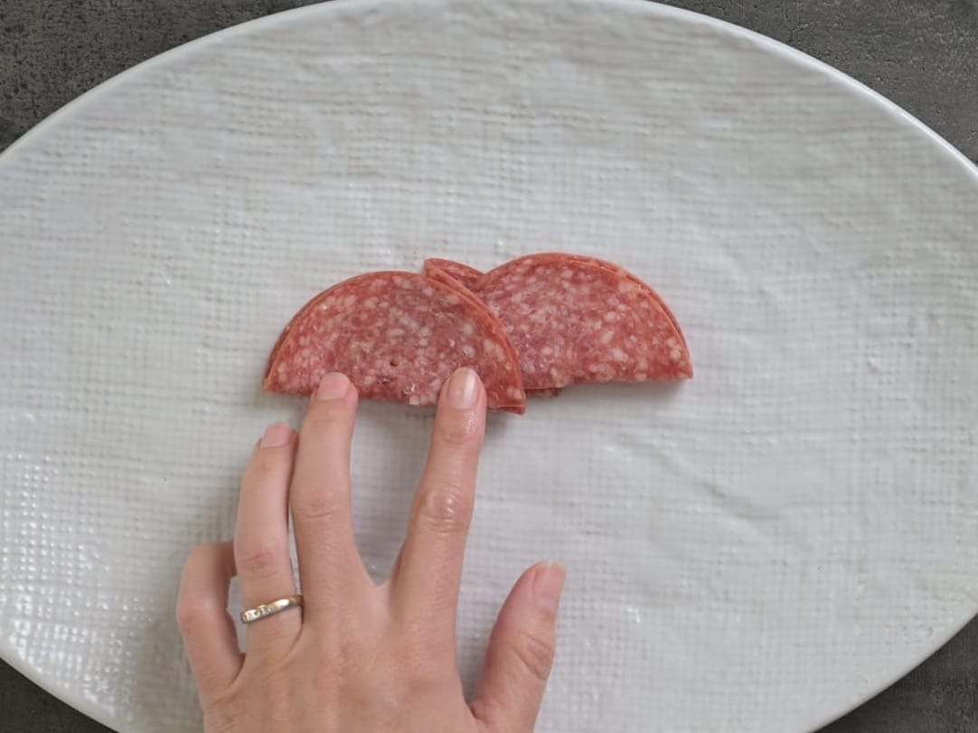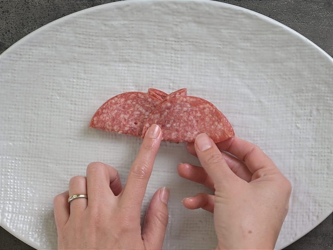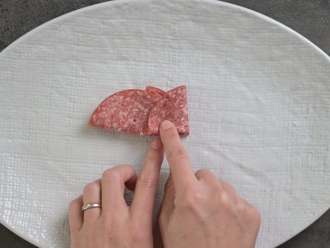 - Fold another slice of salami in half and position it next to the other piece, overlapping from halfway.