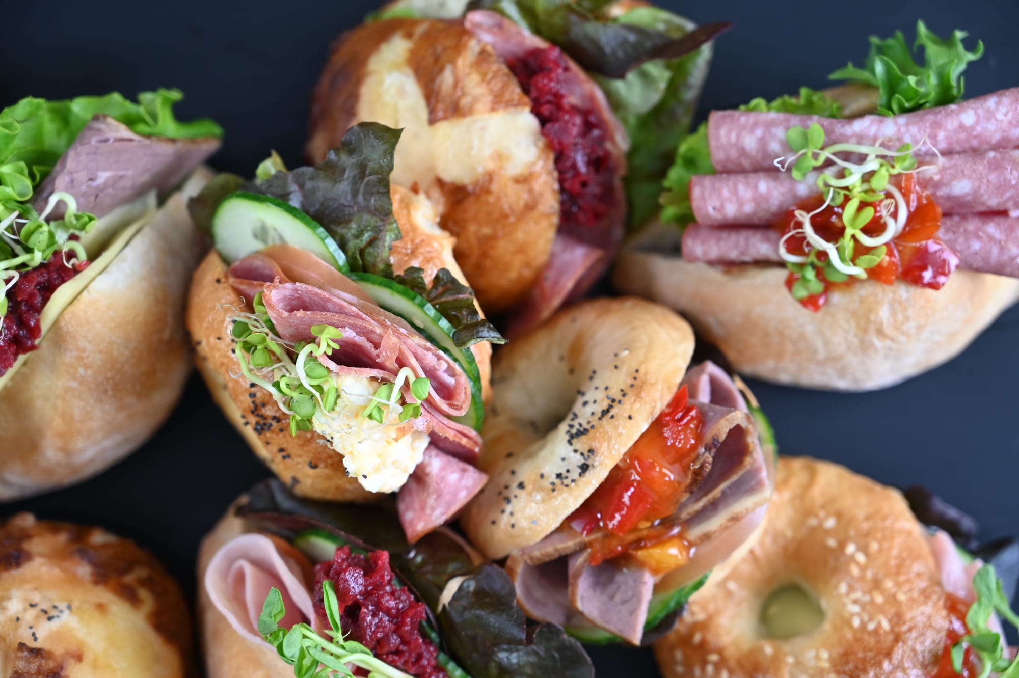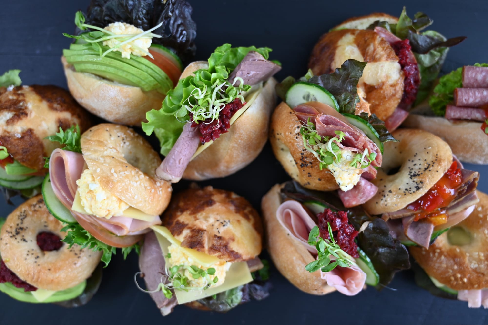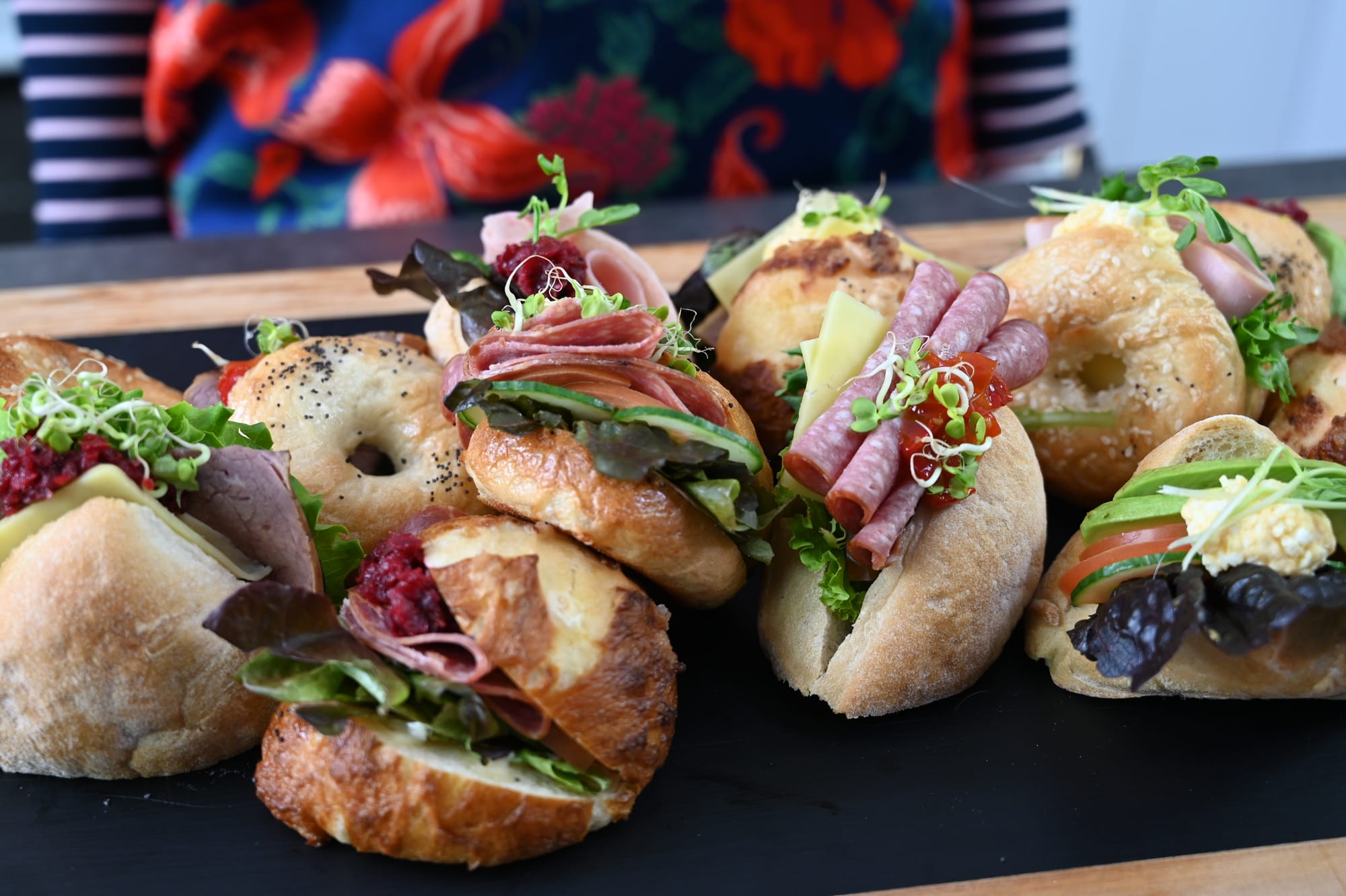 Here is the half moon fold technique used in a filled roll with sliced salami, and on a bagel board as a filling option.