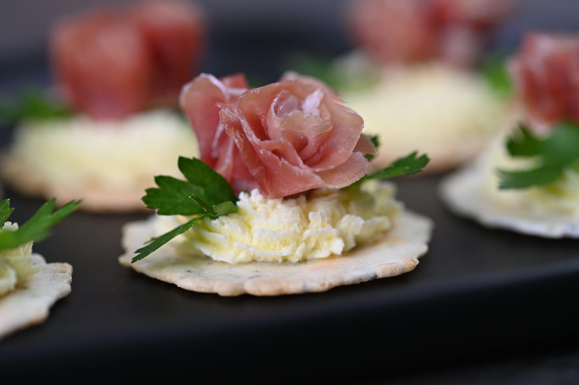 Using the roll fold variation on a pastrami rose appetiser.