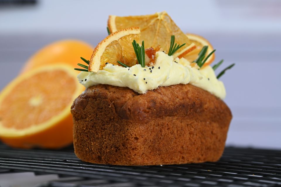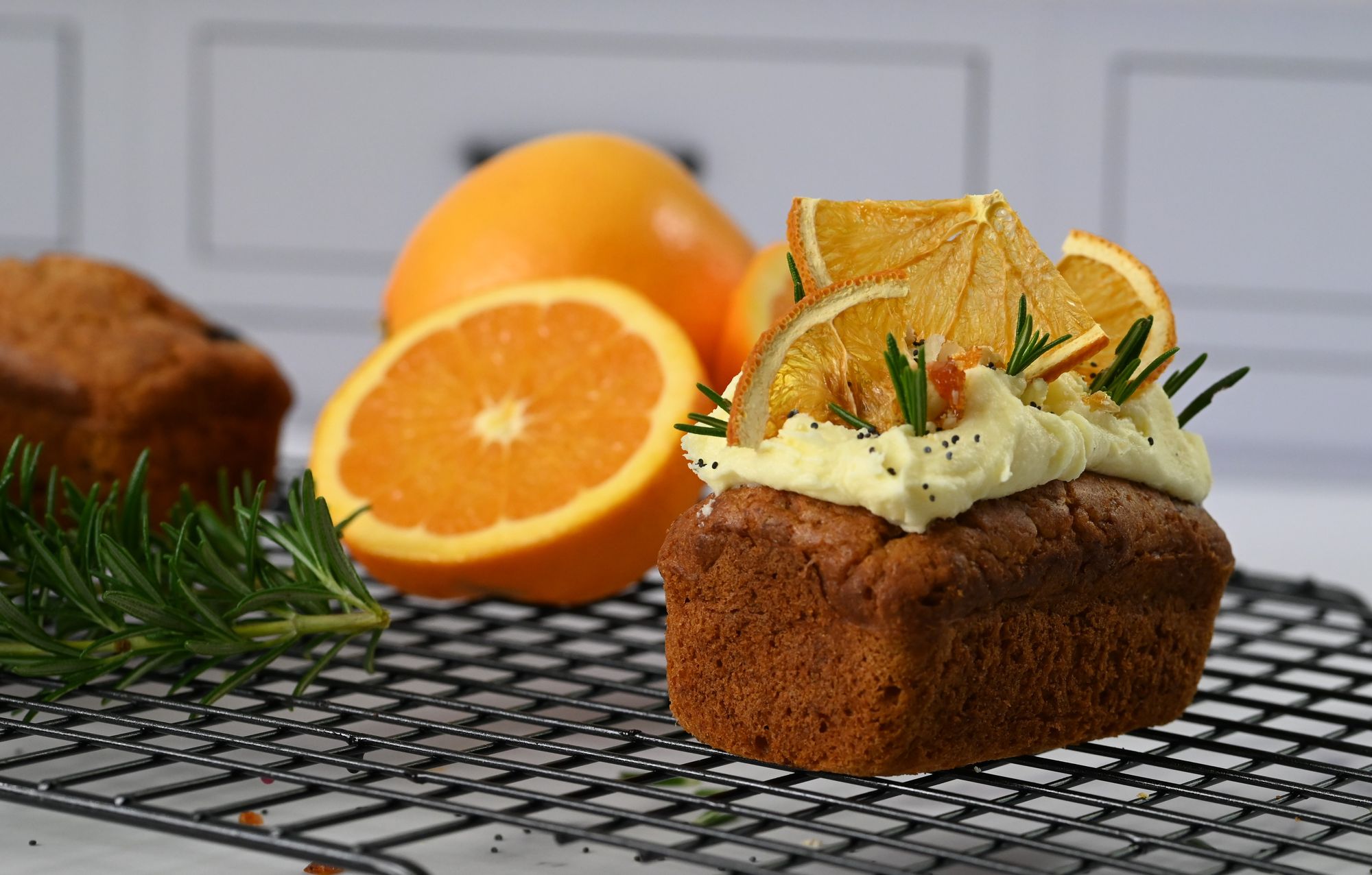 With a little bit of left-over buttercream waiting to be used, my first move was to add some icing. Next, I stumbled upon some dried orange slices from a dessert I made a few weeks back (one of the advantages of garnishes that keep)! These slices were a delightful addition, offering a crispy texture and an intense burst of orange flavour. Digging into my freezer, I unearthed a hidden gem: walnut praline. A quick chop and a sprinkle later, the loaves were already showing promise.