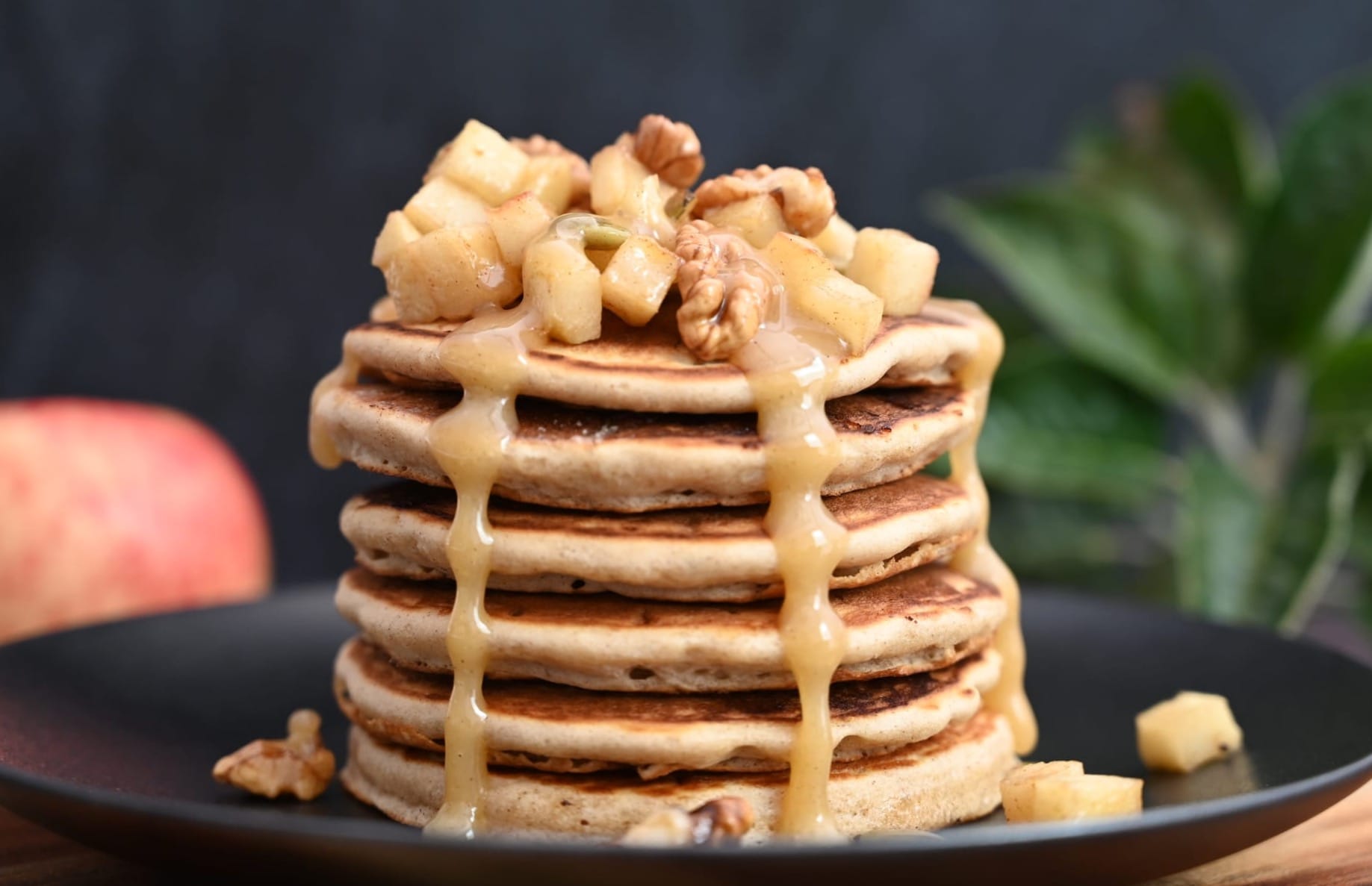 Cinnamon pancakes with caramelised apples and walnuts and a caramel sauce.