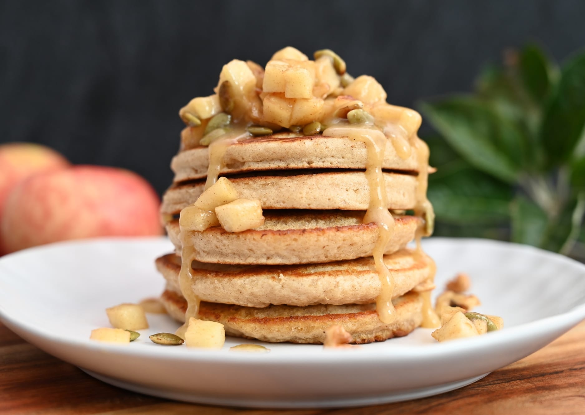 Starting with a straightforward pancake recipe (included below), I infused it with warm, spicy notes by adding some ground cinnamon. Next, I sautéed diced apples in butter and brown sugar until they caramelized, adding chopped walnuts and pumpkin seeds for a delicious crunchy texture.