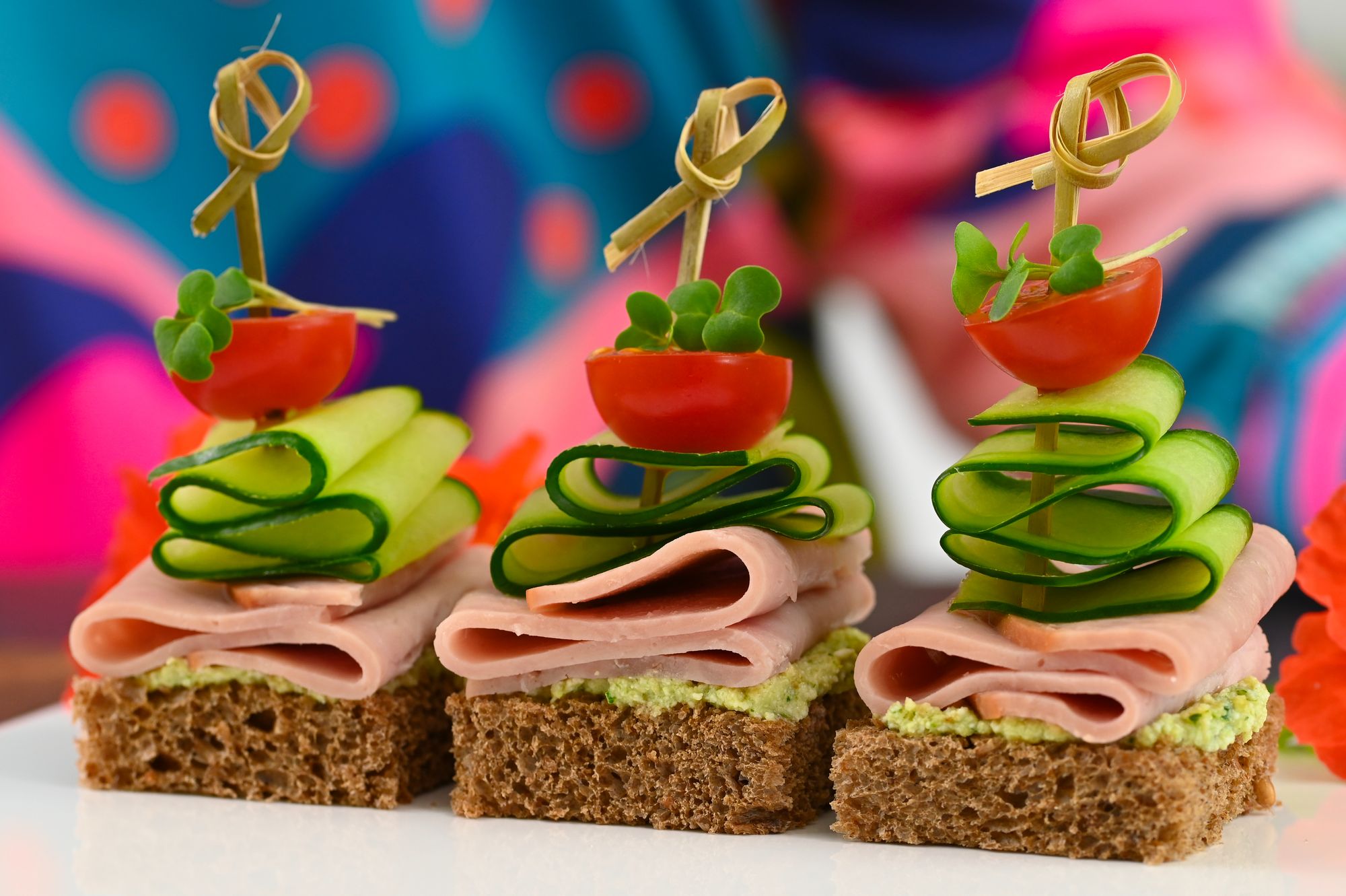 - Gently fold one strip of ham in a loose zigzag, do the same with one strip of cucumber, top with a cherry tomato half and then stick the skewer right through the centre.